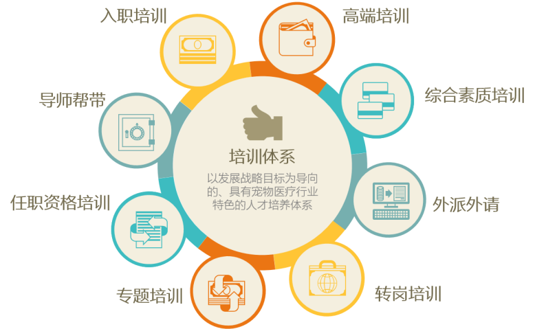 目前,新瑞鹏集团各类培训场地总面积超过1万多平米,可容纳 上千人人同期培训,每年学员课时数达 66 万小时, 100%覆盖所有员工。新瑞鹏集团在培训模块,形成了以发展战略目标为导向的、具有宠物医疗行业特色的人才培养体系, 面向全行业,源源不断地输出宠物医疗行业各类 经营、管理、技术人才,推进整个行业迈向新高度!