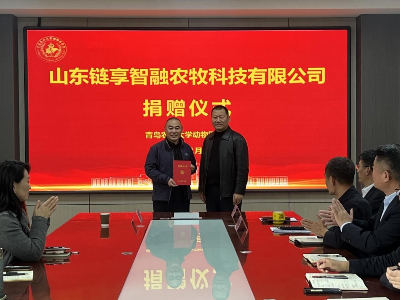 11月13日下午,山东链享智融农牧科技有限公司捐赠仪式在太阳集团tyc234cc会议室举行。