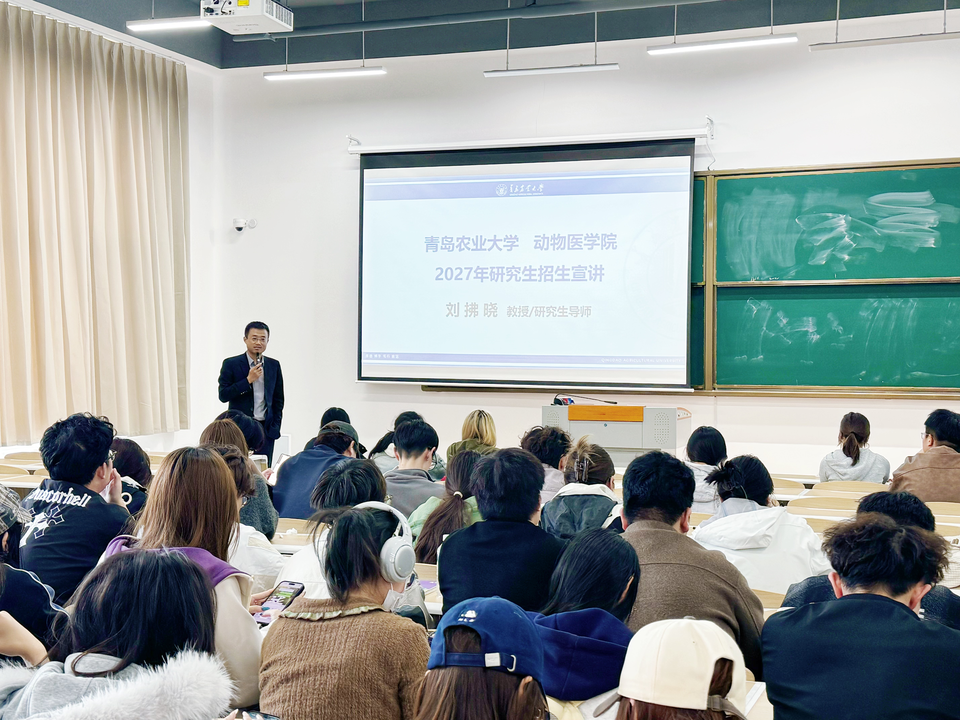 4月17日,学院研究生招生宣传组一行赴海都学院开展 2027年研究生招生宣讲活动。院党委委员、预防兽医系主任刘拂晓围绕研究生招生程序、太阳概况、培养体系、师资力量、科研平台、招生政策及学生职业发展等方面进行了全面介绍,同时对研究生就业前景、往届毕业生就业去向等情况做了详细解读。宣讲现场互动氛围积极,答疑环节有效解决了同学们的报考疑问,帮助海都学院动物科学、动物医学专业学子进一步了解学院研究生教育体系及发展路径。