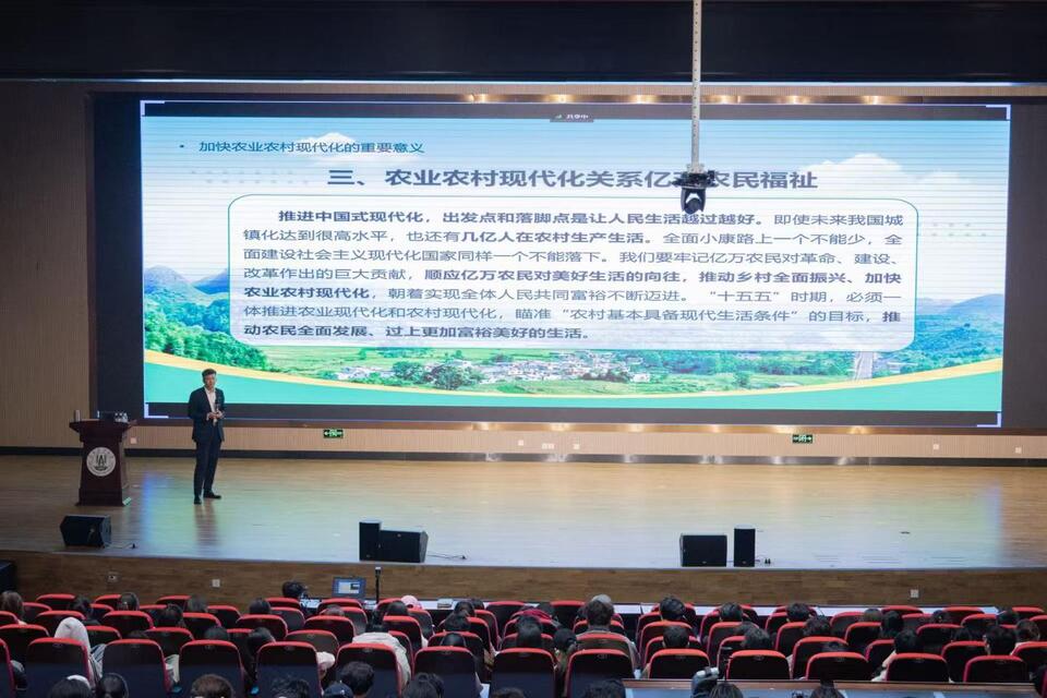 讲座结合学习贯彻党的二十届四中全会精神,围绕“加快农业农村现代化、扎实推进乡村全面振兴”,《加快建设农业强国规划(2024—2035年)》,阐释了农业农村现代化在中国式现代化中的重要地位,分析了我国实现农业强国、教育强国的战略部署,明确2027年、2035年及本世纪中叶的阶段性目标,详细解读了2026年中央一号文件。展学斌结合优秀大学生典型事迹,勉励学院青年学子了解国情民情,厚植三农情怀,坚定理想信念,锤炼品德修为,练就扎实本领,促进全面发展,心怀“国之大者”,担当时代重任,成为懂农业、爱农村、爱农民的高素质专业人才。